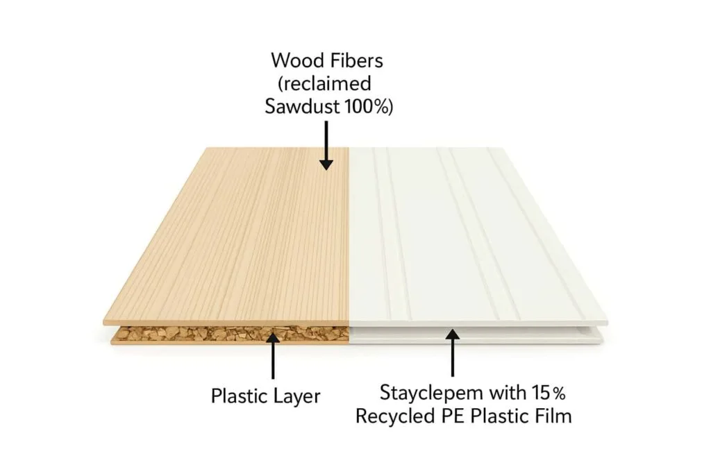 Les lames de terrasse composites mélangent des fibres de bois à du polyéthylène ou du polypropylène. Comme le bois et le plastique sont fusionnés, leur séparation en fin de vie est difficile ; la plupart des centres de recyclage ne peuvent pas trier ce mélange.